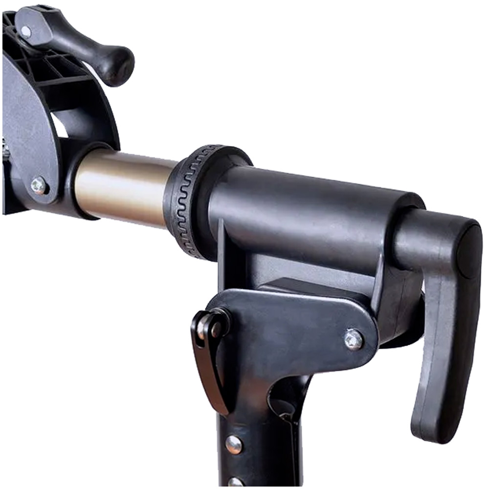Легкая складная ремонтная стойка с опорой на две ноги. Велосипед фиксируется за верхнюю трубу рамы без помощи инструмента, зажим вращается на 360 градусов. Рабочая высота 102-161 см, вес в упаковке 5,8 кг, в комплекте лоток для инструмента. Стойка компактно складывается для перевозки.