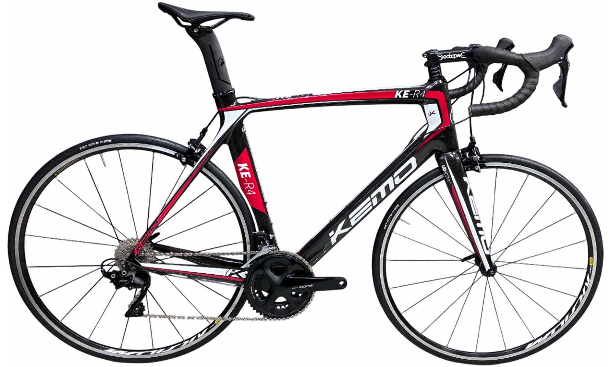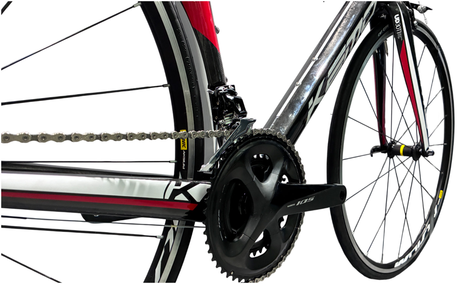 Шоссейный карбоновый велосипед начального профессионального уровня собран на оборудовании Shimano 105 R7000, оснащен колесами Маviс Аksium и ободными механическими тормозами. Вес велосипеда в данной комплектации: 8.190 г.